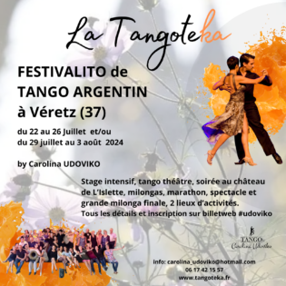 Start: 2024-07-22// End: 2024-08-04// Location: Véretz// FR// Registration Start: 2024-02-08. Programme STAGE TANGO DE BAL : 150 euros par personne Module de 5 cours de 1H30h/jour du 22 au 26 juillet ou du 29 juillet au 2 août. Niveaux technique de base (17H à 18H30) intermédiaires/avancés( 18H30 à 20H). Lieu : La Tangoteka,Start: 2024-07-22// End: 2024-08-04// Location: Véretz// FR// Registration Start: 2024-02-08.