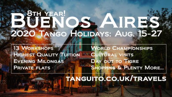 Start: 2020-08-15// End: 2020-08-27// Location: Buenos Aires// AR// Registration Start: 2020-02-10. Aug. 15-27, 2020: 13 days of tango open to all in the Argentine capital. Make the trip of a lifetime, and experience tango at its best during the Worldwide championships! Solo travelers and couplesStart: 2020-08-15// End: 2020-08-27// Location: Buenos Aires// AR// Registration Start: 2020-02-10.