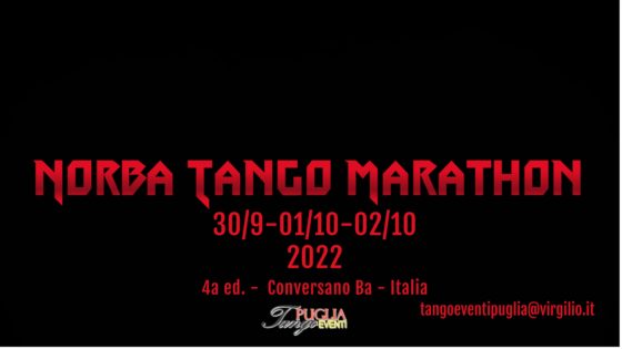 Start: 2022-09-30// End: 2022-10-02// Location: CONVERSANO// IT// Registration Start: 2022-05-17. After the success of 2019, and after two special editions of Tango Nights in Salento in 2020 and 2021, we meet again at the Norba Tango Marathon! 4th edition! Special welcome! Great TJs and GreatStart: 2022-09-30// End: 2022-10-02// Location: CONVERSANO// IT// Registration Start: 2022-05-17.