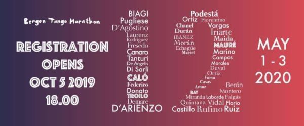 Start: 2022-05-05// End: 2022-05-08// Location: Bergen// NO. Welcome to the 12th Bergen Tango Marathon! Registration at www.bergentangomarathon.no The marathon takes place at Fensal in the center of Bergen, where you will enjoy great music and a wonderful dance floor, lots of fabulous food (all youStart: 2022-05-05// End: 2022-05-08// Location: Bergen// NO.