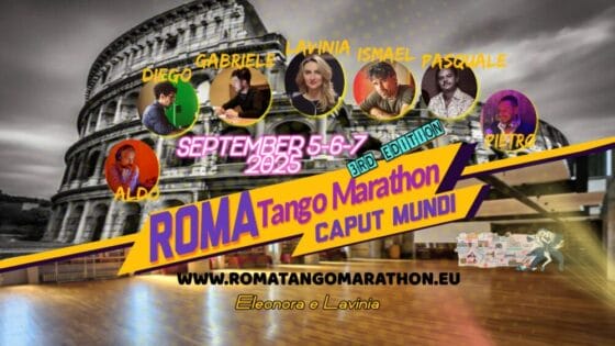 Start: 2025-09-05// End: 2025-09-07// Location: Roma// IT// Registration Start: 2025-02-01. ROMA TANGO MARATHON Caput Mundi – 3rd edition – September 5-6-7, 2025 ENJOY THE FULL PACK all inclusive! 3 days 36 hours of dancing 1 location for rooms, restaurant dancefloor 6 professional & international TDJ’s Fantastic Wooden floor Air conditioning Perfect highStart: 2025-09-05// End: 2025-09-07// Location: Roma// IT// Registration Start: 2025-02-01.