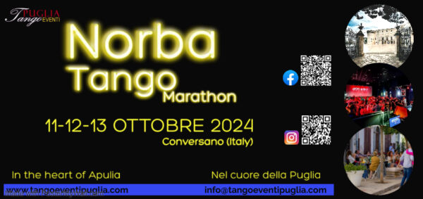 Start: 2024-10-11// End: 2024-10-13// Location: CONVERSANO// IT// Registration Start: 2024-05-20. INGLESE SOTTO – SCORRERE VERSO IL BASSO MARATONA DI TANGO NORBA 11-12-13 Ottobre 2024 CONVERSANO – (Bari) – Italia Ci ritroviamo al Norba Tango Marathon! 5a edizione! PER NOI SEI IMPORTANTE, NON SEI UN NUMERO.Start: 2024-10-11// End: 2024-10-13// Location: CONVERSANO// IT// Registration Start: 2024-05-20.