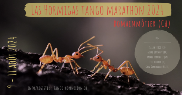 Start: 2024-08-09// End: 2024-08-10// Location: Romainmôtier// CH// Registration Start: 2024-02-09. Following last year’s success, the “Las Hormigas” tango marathon can return ! For this 4th edition, we have selected outstanding DJs, wonderful cooks, and we are going to set up an event exactly as youStart: 2024-08-09// End: 2024-08-10// Location: Romainmôtier// CH// Registration Start: 2024-02-09.