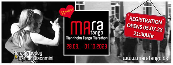Start: 2023-09-28// End: 2023-10-01// Location: Mannheim// DE// Registration Start: 2023-07-05. 11th edition of MAratango role balanced Tango marathon and great learning experience with world class guest teachers Horacio Godoy and Maricel Giacomini.