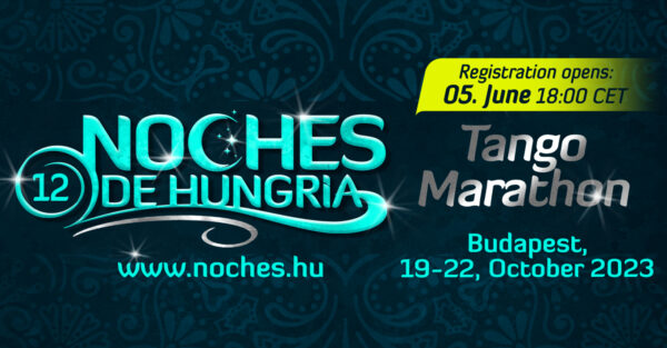 Start: 2023-10-19// End: 2023-10-22// Location: Budapest// HU// Registration Start: 2023-06-05. 12th edition of Noches de Hungría Tango Marathon Budapest Registration starts on 5th June 2023 18:00 CET All details about the Marathon will be available on: www.noches.hu few days before registration opening. see you atStart: 2023-10-19// End: 2023-10-22// Location: Budapest// HU// Registration Start: 2023-06-05.