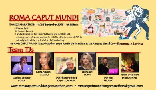 Start: 2023-09-01// End: 2023-09-03// Location: ROMA// IT// Registration Start: 2023-04-10. ROME CAPUT MUNDI – Tango Marathon – 1st Edition – 1/2/3 September 2023 The Marathon in the historic centre of Rome – the Eternal City. – 3 days of Tango – 36 hours of dancingStart: 2023-09-01// End: 2023-09-03// Location: ROMA// IT// Registration Start: 2023-04-10.