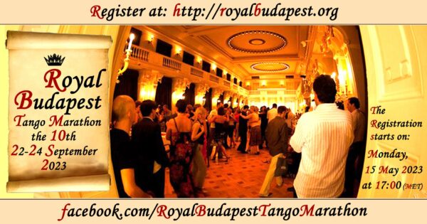 Start: 2023-09-22// End: 2023-09-24// Location: Budapest// HU// Registration Start: 2023-05-15. You are very welcome to the 10th Royal Budapest Tango Marathon 22-24 September 2023 The REGISTRATION on the Marathon website: http://royalbudapest.org The Registration starts on Monday, 15 May 2023, at 17:00 (MET) 21 September 2023:Start: 2023-09-22// End: 2023-09-24// Location: Budapest// HU// Registration Start: 2023-05-15.