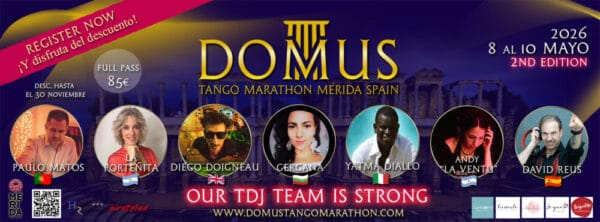Start: 2026-05-08// End: 2026-05-10// Location: Mérida// ES// Registration Start: 2025-09-01. DOMUS TANGO MARATHON 2ND EDICIÓN “El mayor evento de tango en suelo romano.” Si la primera edición fue increíble… ¡prepárense para una segunda inolvidable! ¡DJ’s INTERNACIONALES de primer nivel! DIEGO DOIGNEAU (Londres) GERGANA MAMALOCAStart: 2026-05-08// End: 2026-05-10// Location: Mérida// ES// Registration Start: 2025-09-01.
