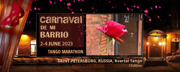 Start: 2023-06-01// End: 2023-06-05// Location: Saint-Petersburg// RU// Registration Start: 2023-01-15. Welcome to the nice cozy marathon Carnaval de mi Barrio at Kvartal Tango, the biggest Tango club in Saint Petersburg during the most beautiful season of Wight Nights. Pass 7500 Russian rubles includes 3 marathonStart: 2023-06-01// End: 2023-06-05// Location: Saint-Petersburg// RU// Registration Start: 2023-01-15.