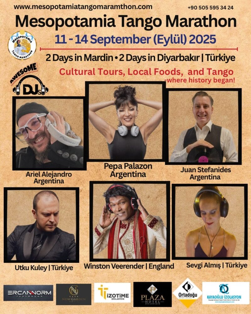 Turkey Mesopotamia Tango Marathon – A Tango Gathering in Mesopotamia. The story of the Mesopotamia Tango Marathon began in 2014 as a festival in Diyarbakir, Turkey. From the very first edition, this unique event has featured world-renowned performers and DJs from the heart of Argentina, specifically from Buenos Aires. After a pause during the pandemic, it has continued its journey in a new format as a tango marathon. Organised by Tango MED School and Kemal Ciwan Isik, the marathon takes place every September, offering an unforgettable tango experience in the ancient cities of Mesopotamia. The first two days of the event are held in Diyarbakir, a city rich in cultural heritage, followed by two inspiring days in the enchanting streets of Mardin. Each edition brings together acclaimed tango DJs and dancers from Buenos Aires, Europe, and across Turkey, blending the passion of dance, the warmth of friendship, and the magical atmosphere of Mesopotamia. More than just a dance event, the Mesopotamia Tango Marathon has become a cultural bridge and a celebration of the tango spirit that transcends borders. In 2025, it is preparing once again to create unforgettable memories for all participants. Contact: +90 505 595 34 24. Mail: mesopotamiatangomarathon@gmail.com